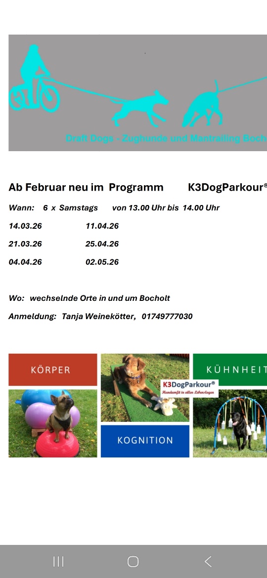 Nachdem ich seit einigen Jahren auch mit meinen Hunden K3DogParkour® mache habe ich nun im Januar 2026 mich auch als Trainerin hierfür weitergebildet.