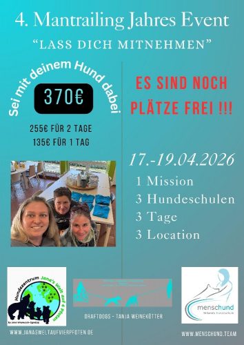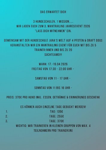 Da mich das Thema Mantrailing sehr interessiert und ich seit Ende 2018 mit meiner Alice schon selber traile, habe ich von 2023 - 2024 bei Dagmar Spillner eine Ausbildung zur Mantrailing-Trainerin gemacht.